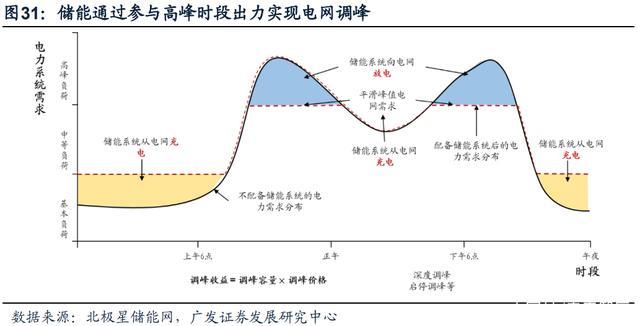 儲能參與調峰價值在于提高資源使用效率。電力系統(tǒng)在實際運行中,用電負荷 高峰僅出現(xiàn)在一天中的某個時段,對于超出發(fā)電機組規(guī)定的出力范圍的深度調峰, 則需要配備一定的發(fā)電機組以應對高峰期間用電需求,維持長時間電力生產與消費 平衡,而儲能系統(tǒng)則可以在谷段或平段充電,在高峰時段放電來滿足調峰需求。除 此之外儲能可以通過調峰來消納新能源發(fā)電,實現(xiàn)雙向收益。