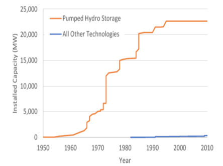 抽水蓄能發(fā)電設(shè)施的建設(shè)和交付周期通常很長,這導(dǎo)致在上世紀90年代以來很少建設(shè)此類項目。圖1顯示了截至2010年這些抽水蓄能電站的累積部署情況,以及其他儲能技術(shù)部署情況(主要是1992年建成的一個壓縮空氣儲能設(shè)施)。