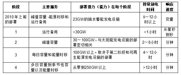 雖然這份調(diào)查報告呈現(xiàn)了四個不同的階段,但每個階段之間的邊界有些模糊。每個階段都以儲能系統(tǒng)的持續(xù)放電時間和提供的相應(yīng)服務(wù)來描述。而報告討了儲能技術(shù)和市場需求,包括對每個階段的潛在部署估計,以及隨著短時儲能市場機會飽和與儲能成本下降的過渡點可能出現(xiàn)的情況。還展示了每個階段(特別是第二階段到第四階段)的規(guī)模如何受到可再生能源發(fā)電量的主要影響。