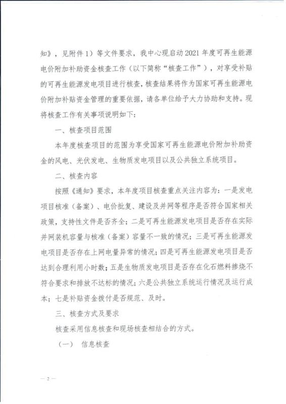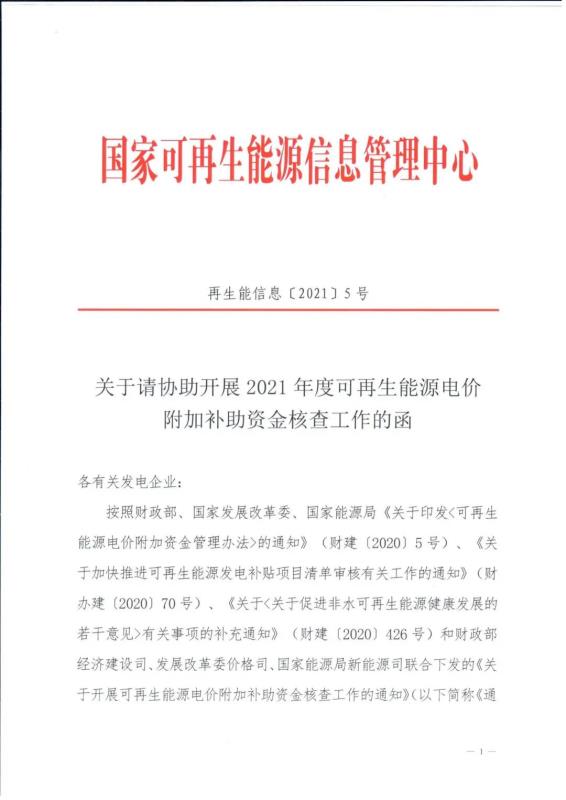 近日,國家可再生能源信息管理中心發(fā)函至各企業(yè)協(xié)助開展2021年度可再生能源電價(jià)附加補(bǔ)助資金核查工作。根據(jù)財(cái)政部經(jīng)建司、國家發(fā)改委價(jià)格司、國家能源局新能源司聯(lián)合下發(fā)的《關(guān)于開展可再生能源電價(jià)附加補(bǔ)助資金核查工作的通知》,國家可再生能源信息中心將對(duì)享受國家可再生能源電價(jià)附加補(bǔ)助資金的風(fēng)電、光伏發(fā)電、生物質(zhì)發(fā)電項(xiàng)目以及公共獨(dú)立系統(tǒng)項(xiàng)目進(jìn)行核查。