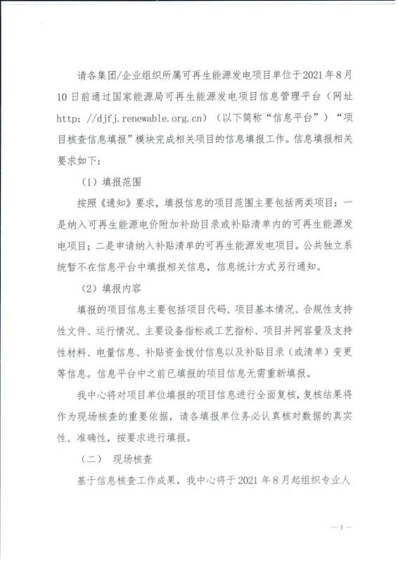 此次核查將采取信息核查與現(xiàn)場(chǎng)核查相結(jié)合的方式,各發(fā)電企業(yè)需要在8月10日前通過國家能源局可再生能源發(fā)電項(xiàng)目信息管理平臺(tái)完成相關(guān)項(xiàng)目的信息填報(bào)工作;基于信息核查工作成果,國家可再生能源信息中心將于2021年8月起組織專業(yè)人員分組開展項(xiàng)目現(xiàn)場(chǎng)核查工作。