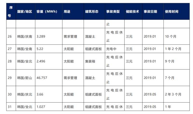 為幫助了解儲能電站發(fā)生火災(zāi)或爆炸事故的情況,接下來對全球儲能項目主要火災(zāi)或爆炸事故的公開信息進行整理,匯總了近10年間發(fā)生事故的儲能電站的基本信息,總結(jié)了起火爆炸事故的基本特征。依據(jù)文獻“韓國鋰離子電池儲能電站安全事故的分析及思考”,給出了儲能電站發(fā)生安全事故的基本原因以及經(jīng)驗總結(jié);并根據(jù)網(wǎng)絡(luò)公開信息,搜集了美國發(fā)生人身傷亡事故的儲能電站爆炸事件的原因及整改措施。