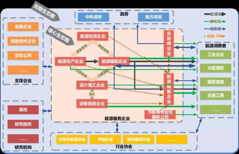 綜合能源服務(wù)的發(fā)展促使產(chǎn)業(yè)分工不斷細(xì)化,產(chǎn)業(yè)生態(tài)加速形成。綜合能源服務(wù)產(chǎn)業(yè)生態(tài)由能源消費(fèi)者、能源服務(wù)企業(yè)、支撐企業(yè)、研究機(jī)構(gòu)、行業(yè)協(xié)會(huì)、政府六部分共同構(gòu)成,呈現(xiàn)出主體眾多、鏈條復(fù)雜的特點(diǎn)。