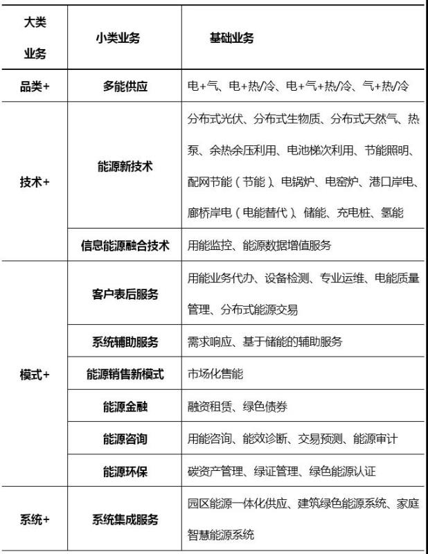 綜合能源服務(wù)業(yè)務(wù)類型十分豐富,從業(yè)務(wù)的“核心特征”來看,可分為“品類+、技術(shù)+、模式+、系統(tǒng)+”四大類,既有簡(jiǎn)單組合式的“綜合”,又有融合創(chuàng)新式的“綜合”。梳理當(dāng)前綜合能源服務(wù)商的典型業(yè)務(wù),形成綜合能源服務(wù)全業(yè)務(wù)表(見表1)。