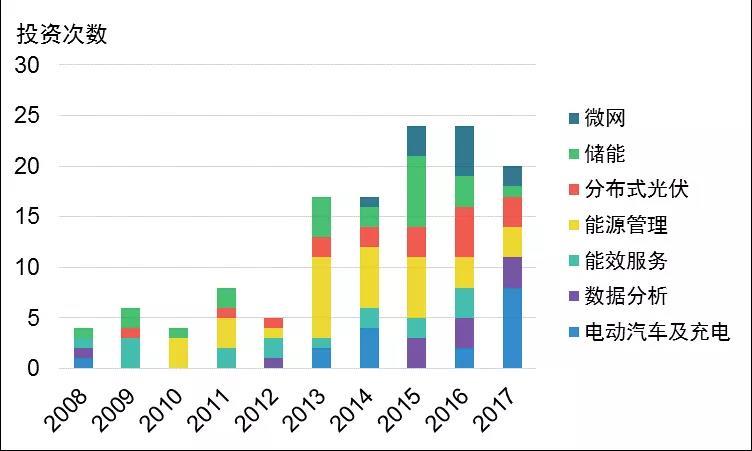 (3)通過(guò)風(fēng)險(xiǎn)投資(VC)、私募股權(quán)投資(PE)進(jìn)行前瞻性布局模式。2013年以來(lái),綜合能源服務(wù)領(lǐng)域的風(fēng)險(xiǎn)投資、私募股權(quán)投資顯著增多。其中對(duì)能源管理、儲(chǔ)能、電動(dòng)汽車及充電投資次數(shù)最多,分別占25%、17%、16%(見圖3)。法國(guó)Engie集團(tuán)是目前進(jìn)行風(fēng)險(xiǎn)投資最多的公司,廣泛投資電動(dòng)汽車、儲(chǔ)能、數(shù)據(jù)分析等領(lǐng)域的優(yōu)質(zhì)初創(chuàng)企業(yè),使其能夠緊密追蹤技術(shù)發(fā)展并具有先發(fā)優(yōu)勢(shì)。
