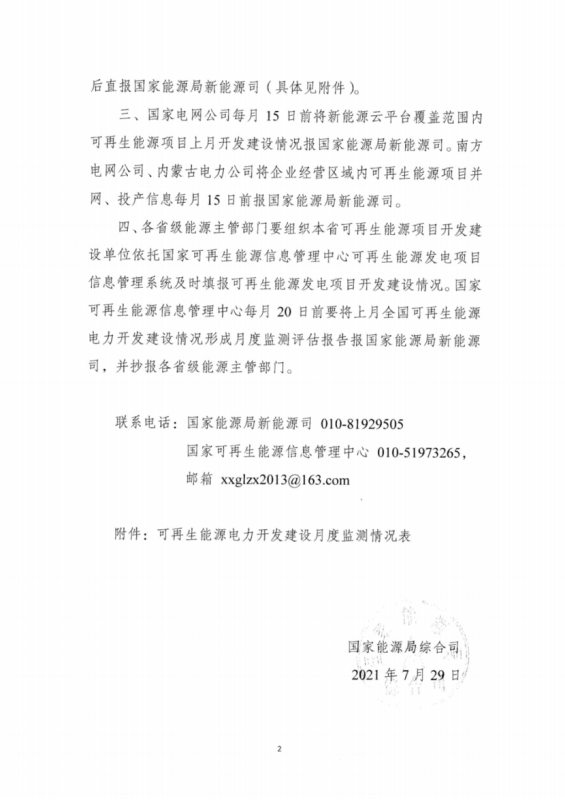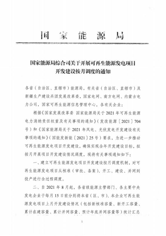 根據(jù)文件,自2021年8月起,各省級能源主管部門、各主要中央發(fā)電企業(yè)需每月15日前分別將本?。▍^(qū)、市)、本企業(yè)可再生能源發(fā)電項目上月開發(fā)建設(shè)情況(包括新核準容量、新開工容量、累計在建容量、累計并網(wǎng)容量、預計年底并網(wǎng)容量等)統(tǒng)計匯總后直報國家能源局新能源司。