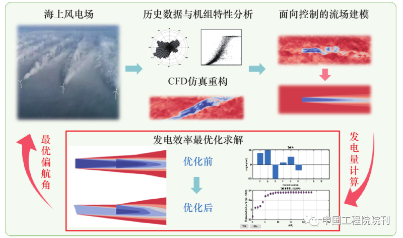 構(gòu)建面向控制的穩(wěn)態(tài)尾流模型,量化機(jī)組間因尾流效應(yīng)產(chǎn)生的功率耦合關(guān)系;通過(guò)優(yōu)化問(wèn)題的構(gòu)建求解,降低尾流效應(yīng)引起的功率損失,提高全場(chǎng)發(fā)電量。結(jié)合模態(tài)分解與頻域分析手段,分析尾流的動(dòng)態(tài)特性,量化尾流效應(yīng)對(duì)機(jī)組載荷的影響,實(shí)現(xiàn)功率–載荷協(xié)同優(yōu)化,風(fēng)電場(chǎng)尾流控制技術(shù)結(jié)構(gòu)如圖 7 所示。