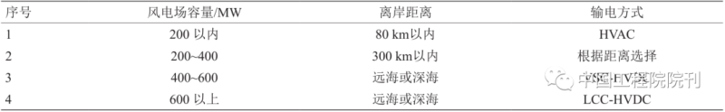 目前海上風(fēng)電單場(chǎng)送出的技術(shù)主要有高壓交流輸電 (HVAC)、常規(guī)直流輸電 (LCC-HVDC)、柔性直流輸電 (VSC-HVDC)、分頻輸電 (FFTS) 四種方式,海上風(fēng)電場(chǎng)輸電方式選擇主要參考風(fēng)電場(chǎng)容量和離岸距離,詳細(xì)見(jiàn)表 5。海上風(fēng)電場(chǎng)開(kāi)發(fā)規(guī)模的擴(kuò)大,輸電容量和輸電距離的增加,機(jī)組大型化、受端電網(wǎng)短路電流水平、電網(wǎng)安全穩(wěn)定等因素,使得海上風(fēng)電輸電直流化方向的發(fā)展趨勢(shì)愈加明顯。
