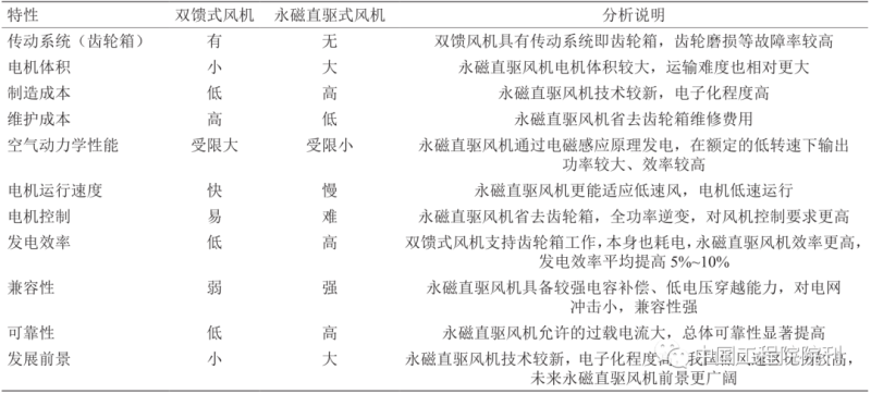 目前國(guó)內(nèi)海上風(fēng)力發(fā)電機(jī)類(lèi)型主要有雙饋風(fēng)機(jī)和永磁直驅(qū)風(fēng)機(jī)兩種。它們的主要區(qū)別在于發(fā)電結(jié)構(gòu)不同,傳動(dòng)不同。永磁直驅(qū)風(fēng)機(jī)相對(duì)雙饋風(fēng)機(jī)效率更高、能耗較小、受風(fēng)速等條件限制小,對(duì)于我國(guó)風(fēng)電行業(yè)發(fā)展具有更重要的意義。但因永磁直驅(qū)風(fēng)機(jī)制造成本較高,控制難度較大,技術(shù)還不成熟等問(wèn)題,國(guó)內(nèi)未來(lái)一段時(shí)間永磁直驅(qū)風(fēng)機(jī)和雙饋風(fēng)機(jī)仍將并行發(fā)展。雙饋式風(fēng)機(jī)與永磁直驅(qū)式風(fēng)機(jī)區(qū)別分析見(jiàn)表 4。