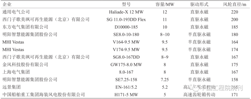 目前海上風(fēng)電機(jī)組向著“大容量、輕量化、高可靠”趨勢(shì)發(fā)展。國(guó)外最大單機(jī)容量達(dá)到 12 MW,國(guó)內(nèi)最大單機(jī)容量為 10 MW,國(guó)內(nèi)外供應(yīng)商主要風(fēng)機(jī)型號(hào)見(jiàn)表 1。