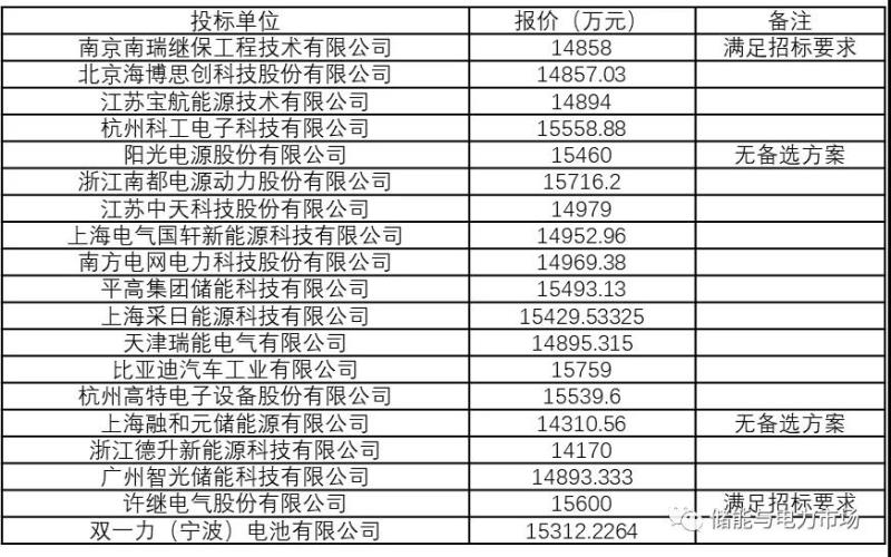 共19家企業(yè)參與投標,報價平均值為15139萬元,平均單價1.5139元/Wh。