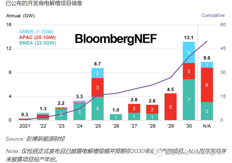 為應對銷售不斷增長的局面,電解槽制造商在建工廠的數量超過所需量。2024年前約有16GW的產能投產,足以滿足數倍的需求。這可能導致很多工廠利用率不足,從而壓低價格。