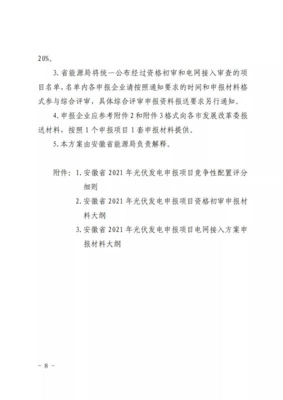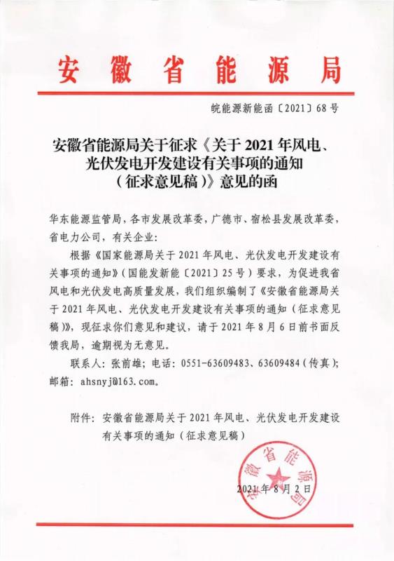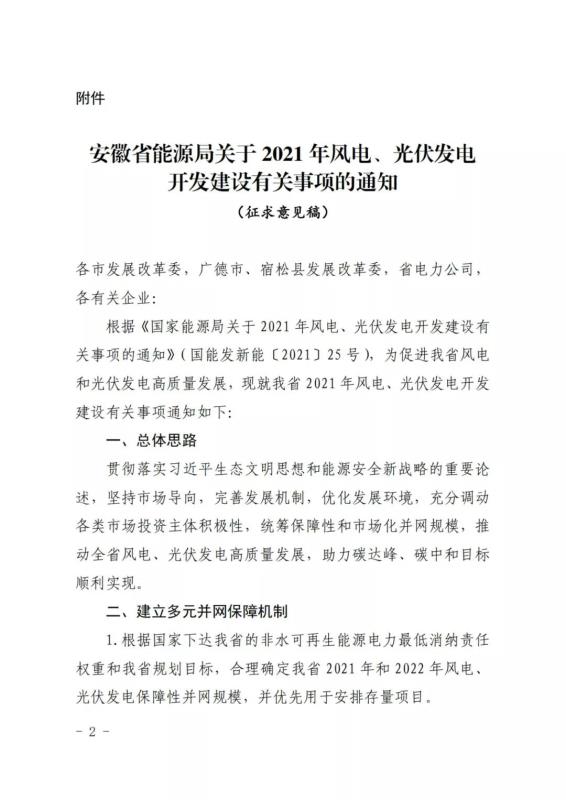 安徽省能源局就2021年度風(fēng)電、光伏發(fā)電開(kāi)發(fā)建設(shè)有關(guān)事項(xiàng)征求意見(jiàn)。
