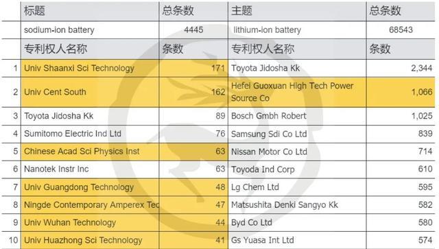 根據(jù)Derwent Innovations Index世界專利數(shù)據(jù)庫(kù)顯示,中國(guó)企業(yè)在鈉離子電池專利申請(qǐng)數(shù)量遠(yuǎn)勝過(guò)日韓、歐美企業(yè),而鋰離子電池專利申請(qǐng)數(shù)量前十名還是他們的天下。