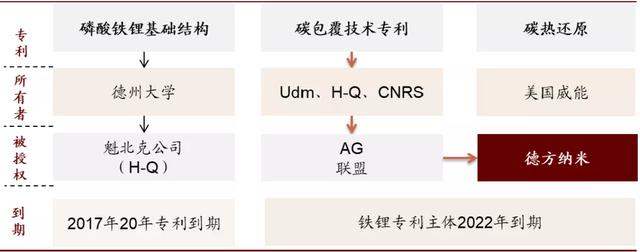1997 年德州大學(xué)Goodenough 教授申請(qǐng)的磷酸鐵鋰的基礎(chǔ)結(jié)構(gòu)和制備工藝專利,并由此延伸了數(shù)十個(gè)專利;由于磷酸鐵鋰本身電導(dǎo)率差,用作電池材料需進(jìn)行改進(jìn),關(guān)鍵手段就在于碳包覆,而這一核心技術(shù)在2000年被加拿大魁北克水力公司申請(qǐng);第三項(xiàng)核心專利碳熱還原,也被英國(guó)企業(yè)Valence公司于2000年申請(qǐng)。