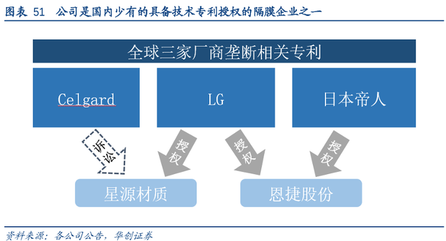 不僅是電解液,還有隔膜核心專利也被緊緊掌握在日韓企業(yè)手上。國(guó)內(nèi)兩家隔膜龍頭,星源和恩捷都是從LG、日本帝人手上得到了專利的授權(quán),而星源在美銷售隔膜產(chǎn)品還被全球干法隔膜巨頭Celegard(如今被日本隔膜巨頭旭化成收購(gòu))認(rèn)為是專利侵權(quán)并向法院提起訴訟。