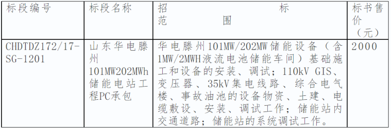 近日,中國(guó)華電開(kāi)啟山東滕州101MW/202MWh儲(chǔ)能電站項(xiàng)目PC招標(biāo),采購(gòu)內(nèi)容包含華電滕州101MW/202MW儲(chǔ)能設(shè)備(含1MW/2MWH液流電池儲(chǔ)能車(chē)間)基礎(chǔ)施工和設(shè)備的安裝、調(diào)試;110kV GIS、變壓器、35kV集電線路、綜合電氣樓、事故油池的設(shè)備物資、土建、電纜敷設(shè)、安裝、調(diào)試工作;儲(chǔ)能站的系統(tǒng)調(diào)試工作等。要求投標(biāo)人從2018年1月1日至投標(biāo)截止日具有至少3個(gè)300MW及以上火電機(jī)組施工總承包業(yè)績(jī)。