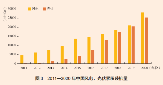 在顛覆性技術(shù)的研發(fā)、應(yīng)用方面,后來者可以居上。2000年前后,中國風(fēng)力發(fā)電和光伏發(fā)電的概念在媒體和技術(shù)研究中均較為少見。到2010年前后,中國的風(fēng)、光電力設(shè)備的生產(chǎn)、安裝和使用,才真正起步。之后,中國的發(fā)展突飛猛進(jìn),從微不足道到獨(dú)領(lǐng)風(fēng)騷,只用了10年多時(shí)間。中國電力大數(shù)據(jù)顯示(見圖3),2011—2020年,中國的光伏裝機(jī)從212萬千瓦猛增到2億5千多千瓦,增加了119倍!其間,光伏上網(wǎng)電價(jià)補(bǔ)貼從每度電2元到2018年后的平價(jià)上網(wǎng),市場競爭力超過煤電。中國的光伏組件在世界上具有較大的競爭優(yōu)勢(shì),以至于歐美發(fā)達(dá)國家冒天下之大不韙,直接干擾國際市場交易,動(dòng)用“雙反”手段打壓中國產(chǎn)品。