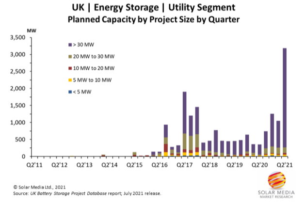 中國儲(chǔ)能網(wǎng)訊:根據(jù)調(diào)研機(jī)構(gòu)的調(diào)查,英國計(jì)劃部署電池儲(chǔ)能系統(tǒng)數(shù)量和裝機(jī)容量正在不斷增加,目前提交部署計(jì)劃的800多個(gè)儲(chǔ)能項(xiàng)目總裝機(jī)容量達(dá)到20GW以上。根據(jù)行業(yè)媒體的報(bào)道,英國最近提交的儲(chǔ)能部署計(jì)劃數(shù)量激增, 2021年第二季度提交的計(jì)劃部署的儲(chǔ)能系統(tǒng)裝機(jī)容量創(chuàng)下新紀(jì)錄。