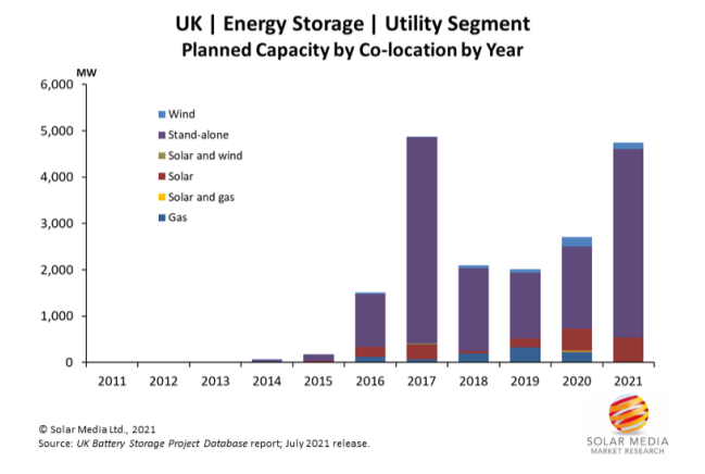 從2021年初到目前為止提交的儲(chǔ)能部署總裝機(jī)容量為4.7GW。因此可以預(yù)計(jì),2021年英國計(jì)劃部署的儲(chǔ)能系統(tǒng)裝機(jī)容量將創(chuàng)下歷年來最高記錄。