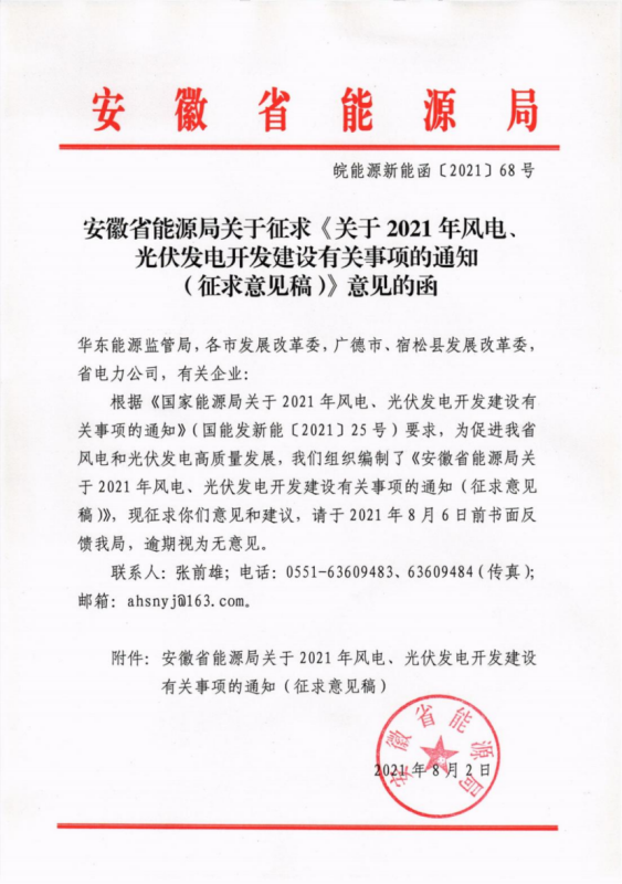 8月2日,安徽省能源局公布了關(guān)于征求《2021年風(fēng)電、光伏發(fā)電開發(fā)建設(shè)有關(guān)事項(xiàng)的通知(征求意見稿)》意見的函。意見稿中明確,安徽省2021年的光伏與風(fēng)電保障性規(guī)模,優(yōu)先用于安排存量項(xiàng)目。