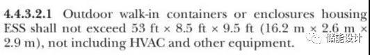 解讀:對戶外布置的步入式儲能電池艙,尺寸一般不超過16.2×2.6×2.9米(長×寬×高),超過時需按照戶內(nèi)布置滿足嚴苛的條件。國內(nèi)很多儲能項目考慮艙內(nèi)檢修維護的便捷,艙體尺寸會采用2.8~3米的寬度,但艙內(nèi)能量水平并無差別,因此,仍可按照本條款對應(yīng)的要求進行參照執(zhí)行。