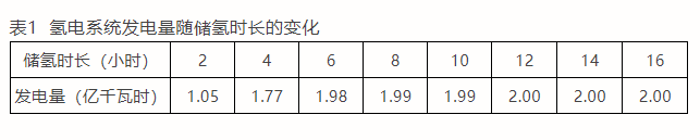 以內(nèi)蒙古風(fēng)光資源較好的地區(qū)為例,以電源基地風(fēng)電/光伏/火電裝機(jī)規(guī)模為4000MW/8000MW/4000MW、配置1000MW/2000MWh鋰離子儲(chǔ)能為基礎(chǔ)條件,當(dāng)固定配置500MW電解水制氫系統(tǒng)、儲(chǔ)氫時(shí)長(zhǎng)從2小時(shí)增加到16小時(shí),考慮以可再生能源電解水制氫—?dú)怏w儲(chǔ)氫—?dú)淙剂想姵匕l(fā)電體系的氫電系統(tǒng)的發(fā)電量隨儲(chǔ)氫時(shí)長(zhǎng)的變化如表1所示。