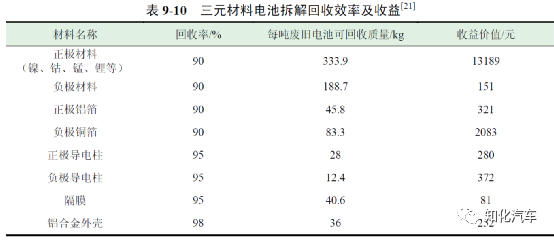 陶志軍和賈曉峰通過對北京賽德美動力電池回收產(chǎn)業(yè)的調(diào)研,發(fā)現(xiàn)動力電池回收過程中,成本主要集中在原材料回收、電池拆解預(yù)處理、廢水廢棄物處理、人工費用等階段,表9-9 為每噸廢舊電池回收處理成本。其中,廢舊三元電池平均回收費用為8900 元/t,經(jīng)過梯次利用之后且質(zhì)量較差的磷酸鐵鋰電池平均回收費用為4000 元/t。從調(diào)研數(shù)據(jù)可以看出,回收及拆解每噸三元電池的平均成本為13264 元,回收及拆解每噸磷酸鐵鋰電池的平均成本為8364 元,動力電池內(nèi)富含的大量的有價金屬是電池回收主要的收益來源,特別是近年來鎳、鈷、錳、鋰等金屬材料價格的上漲對動力電池拆解回收領(lǐng)域起到了巨大的促進作用。