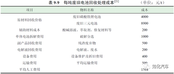濕法回收工藝的成本主要來源于原材料回收成本、廢水廢棄物處理等方面,表9-12 為每噸廢舊電池濕法回收工藝處理成本。濕法回收工藝每處理一噸三元電池的平均成本為14815 元,每處理一噸磷酸鐵鋰電池的平均成本為9915 元。此外,采用濕法回收工藝對電池有價值材料回收的效率較高,因此收益情況也更明顯。