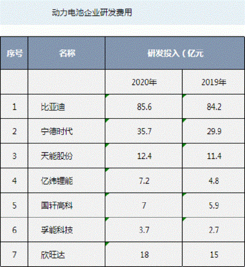 注:上表排序兼顧了動(dòng)力電池營(yíng)收,營(yíng)收占比小的做了加權(quán)處理。比亞迪85.56億元的研發(fā)投入費(fèi)用不只是針對(duì)其動(dòng)力電池業(yè)務(wù),汽車相關(guān)營(yíng)收占比只有53%,這還包括了其龐大的整車及各零部件部分,欣旺達(dá)動(dòng)力電池營(yíng)收占比只有1.44%。