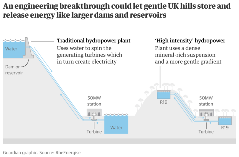 但是,這個“水電工程”實(shí)際上不是用的不是水,而是使用一種高密度的流體,其密度是水的兩倍半以上,因此可以儲存更多的電能。推動這個項(xiàng)目的公司RheEnergise表示,在電力需求較低的時(shí)候,該項(xiàng)目將把高密度液體泵到200米的山上,存放在一個比奧運(yùn)會游泳池還大的地下儲水池里。然后,當(dāng)需要額外的電力時(shí),這些液體就會回流通過渦輪機(jī)發(fā)電,向電網(wǎng)供電。