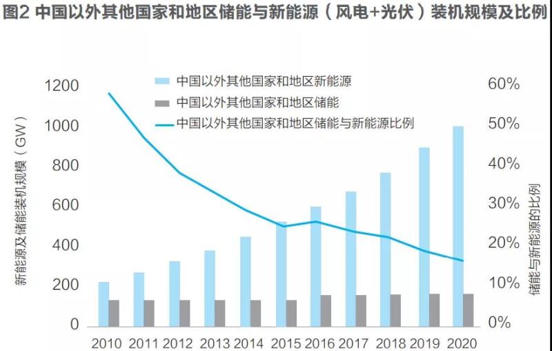 儲能是解決高比例新能源并網(wǎng)消納的重要支撐,儲能產(chǎn)業(yè)的發(fā)展得到了高度重視。近年來中國及全球儲新比數(shù)據(jù)的下降幅度都已經(jīng)明顯趨緩;考慮儲能技術(shù)的發(fā)展和市場需求,預(yù)計中國以外世界其他國家和地區(qū)的儲新比有可能在2024年左右達到最低值,預(yù)計為13-15%左右,之后趨于穩(wěn)定或略有回升。假設(shè)全球風電和光伏裝機按照平均每年10%的增速發(fā)展,到2030年累計裝機將達3900GW;而全球儲能裝機規(guī)模若按13-15%的比例計算,2030年將達507-585GW的規(guī)模(截至2020年底為192.2GW)。