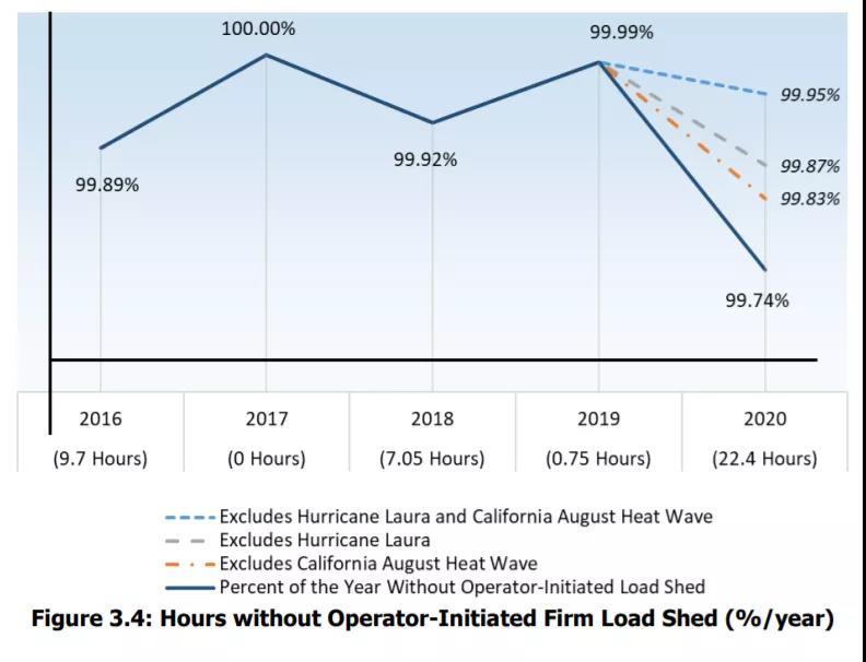NERC的可靠性報(bào)告中包含了一張“非人為操作導(dǎo)致的固定負(fù)荷切除小時(shí)數(shù)”的圖表,可以看出由于颶風(fēng)勞拉和加州持續(xù)高溫天氣的影響,2020年美國(guó)大規(guī)模電網(wǎng)的供電可靠性已經(jīng)出現(xiàn)明顯下降。然而,當(dāng)前電網(wǎng)面臨的實(shí)際情況比圖片所反映的還要更加嚴(yán)重。在2021年上半年德克薩斯州的極寒天氣事件中,系統(tǒng)固定負(fù)荷切除時(shí)間已經(jīng)達(dá)到70個(gè)小時(shí),這意味著2021年度該指標(biāo)只會(huì)進(jìn)一步惡化。