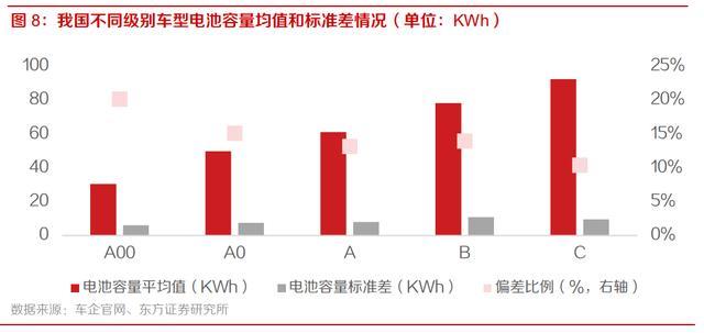 同級別車型的空間差距基本在可控范圍內(nèi),電池容量標準差比例基本在 20%以內(nèi)。如目前在售 A 級車平均電池容量為 61 度,標準差為 8 度,偏差比例 13%;C 級車的偏差比例更是僅有 10%, 基于蔚來汽車中型 SUV ES6 和中大型 SUV ES8 通用電池包的經(jīng)驗,同級別車型更容易設計出尺 寸統(tǒng)一,容量可變的電池包來滿足幾乎大部分同級別車型適用。