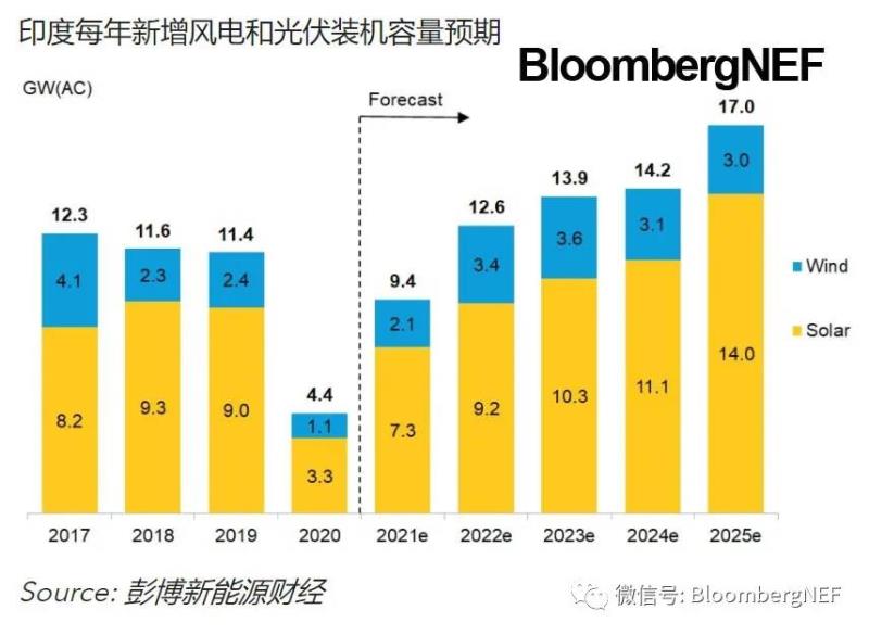 印度的可再生能源并網(wǎng)裝機(jī)容量在2021年8月已達(dá)100GW(不計(jì)入大型水電),這一數(shù)值在2015年底還不到40GW。由于2030年裝機(jī)容量目標(biāo)是450GW,其中光伏和風(fēng)電的最低目標(biāo)分別為280GW和140GW,這一增速需要得到維持。