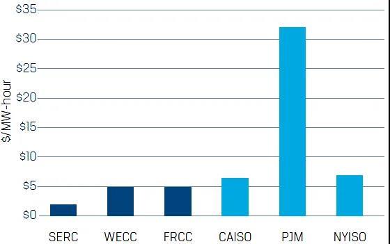 注:SERC、WECC、FRCC為北美可靠性管理委員會(huì)下屬的區(qū)域可靠性委員會(huì)管轄的垂直一體化地區(qū),儲(chǔ)能調(diào)頻收益基于固定價(jià)格確定,CAISO、PJM和NYISO為放開管制的電力市場(chǎng),儲(chǔ)能收益基于市場(chǎng)競(jìng)爭(zhēng)機(jī)制確定。
