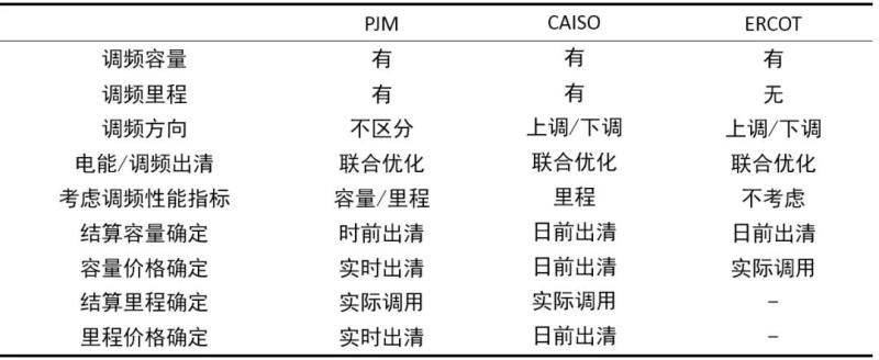 在交易和結(jié)算方式方面,PJM采用日前報(bào)價(jià)預(yù)出清、時(shí)前出清確定容量、實(shí)時(shí)出清確定價(jià)格和里程的方式,按照實(shí)時(shí)出清價(jià)格結(jié)算;CAISO日前確定出清價(jià)格和調(diào)頻容量,調(diào)頻里程按照實(shí)際調(diào)用里程結(jié)算;ERCOT采用日前確定出清價(jià)格、按照實(shí)際調(diào)用情況結(jié)算。