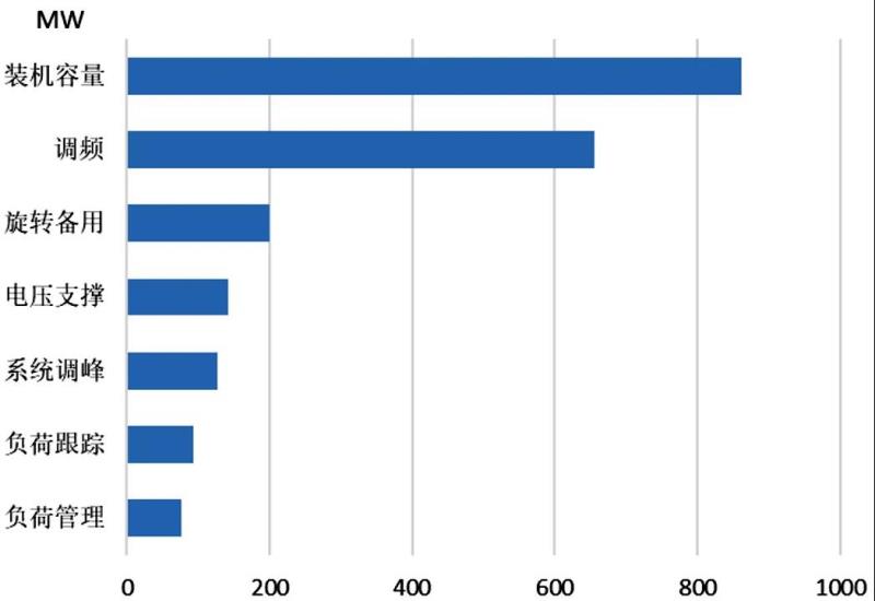 圖1 美國(guó)電池儲(chǔ)能參與不同服務(wù)場(chǎng)景的容量