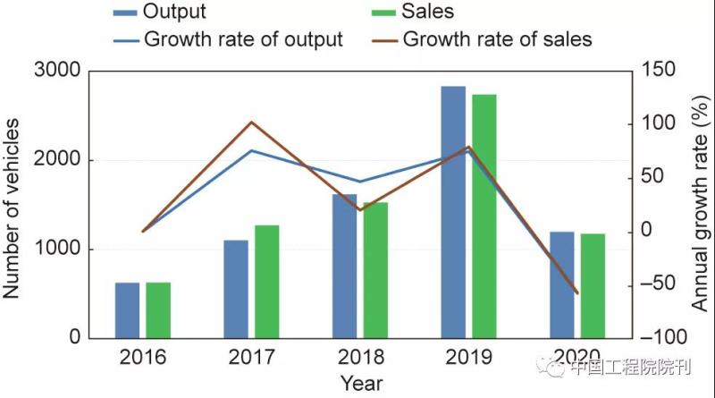 圖1 2016—2020年我國(guó)氫燃料電池汽車(chē)產(chǎn)銷(xiāo)量