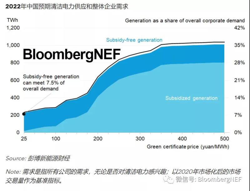 由于發(fā)電企業(yè)也可以將電力出售給電網(wǎng),有意參與綠電交易試點的企業(yè)將需要支付溢價,預(yù)計會比當(dāng)前電價高5-38%,利潤率不高或需求較大的企業(yè)可能會因此望而卻步。彭博新能源財經(jīng)預(yù)計,2022年中國無補(bǔ)貼的電力將僅能滿足整體企業(yè)需求(無論企業(yè)是否對清潔電力感興趣)的7.5%。實際需求難以衡量,但市場在啟動之初預(yù)計將出現(xiàn)熱情迸發(fā)的局面。