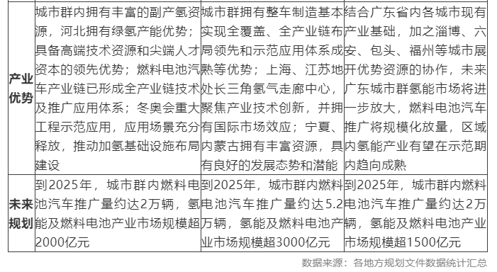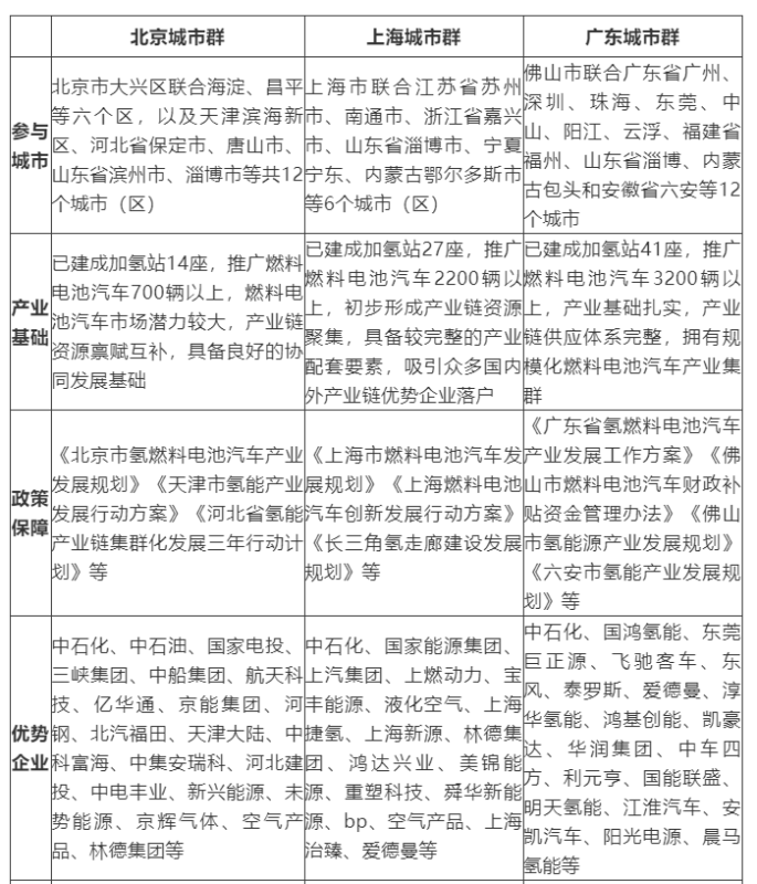 三大示范城市群產(chǎn)業(yè)布局與發(fā)展目標(biāo)雖各有不同,但均已形成了較為完整的產(chǎn)業(yè)體系,擁有穩(wěn)定的氫源和綠氫供應(yīng)潛力,依托各地相關(guān)政策支持,集聚了一批有實(shí)力的企業(yè),并擁有廣闊的應(yīng)用市場(chǎng)可供產(chǎn)業(yè)發(fā)展壯大。