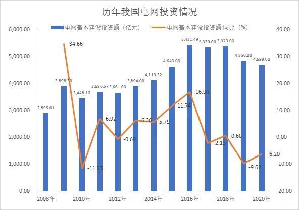 “十三五”期間,我國電網投資總體呈現(xiàn)下滑態(tài)勢,尤其是2020年電網投資只有4699億元,創(chuàng)“十三五”新低,引發(fā)了市場對電網投資下滑的擔心。