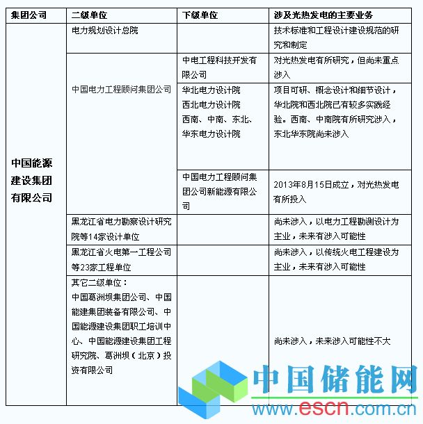 中國電力工程顧問集團公司(簡稱中電工程)下轄東北、華東、中南、西北、西南、華北六大區(qū)電力設(shè)計院和中國電力建設(shè)工程咨詢公司、科技開發(fā)有限公司、北京洛斯達科技發(fā)展有限公司共9 家全資子企業(yè)。是對光熱發(fā)電業(yè)務(wù)涉入最多的二級單位。