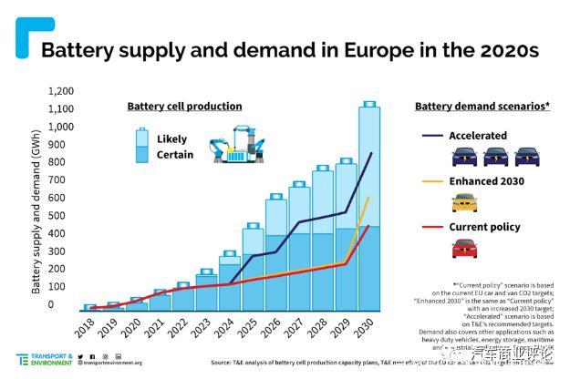 歐洲運輸環(huán)境聯(lián)合會(以下簡稱T&E)的一份報告指出,歐洲想要依靠本土電池企業(yè)達到供應量并不容易,期間仍然會嚴重依賴亞洲電池和技術(shù),這種情況甚至會一直持續(xù)到2029-2030年。這也是在這輪“新基建”中,歐洲對于中國頭部企業(yè)給予了政策、財政等支持的原因所在。
