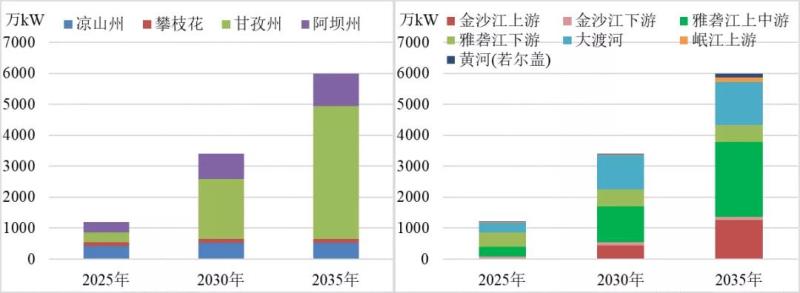 預(yù)計(jì)四川省2030年、2035年水電裝機(jī)達(dá)到1.22、1.24億千瓦,開發(fā)程度達(dá)82.0%和83.5%;2030年水電開發(fā)接近完成,2035年基本開發(fā)完畢。預(yù)計(jì)2030年、2035年省內(nèi)消納新能源可達(dá)4700萬(wàn)千瓦和7500萬(wàn)千瓦左右。從區(qū)域上看,2030年涼山州風(fēng)電基本開發(fā)完畢。2025年以后新增光伏主要分布在甘孜州和阿壩州,2035年光伏主要集中在甘孜州,新增新能源多分布在流域上游水電較少地區(qū)。
