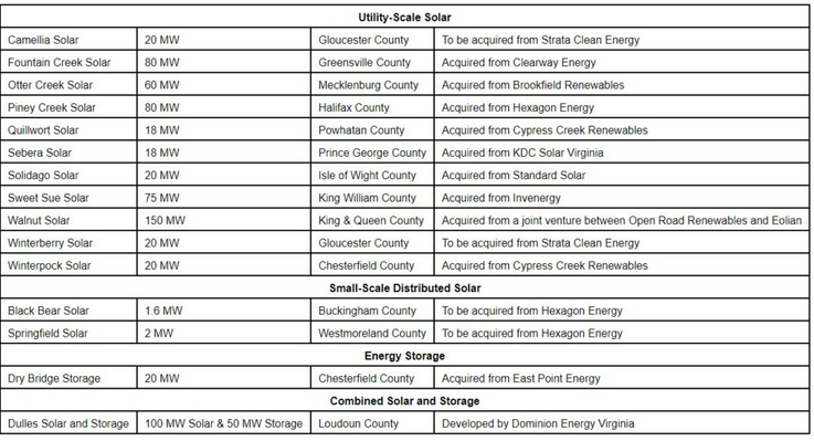 該項(xiàng)目組合由Dominion Energy公司擁有和運(yùn)營,其中包括11個(gè)公用事業(yè)規(guī)模太陽能發(fā)電項(xiàng)目、2個(gè)小型分布式太陽能發(fā)電項(xiàng)目、1個(gè)太陽能+儲(chǔ)能項(xiàng)目和1個(gè)獨(dú)立部署的電池儲(chǔ)能項(xiàng)目。