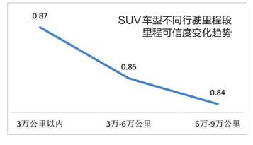 聯(lián)盟還特意將轎車與SUV分開進(jìn)行了比較,結(jié)果顯示,相比轎車,SUV車型的里程可信度略低一些。累計行駛里程3萬公里以內(nèi)、3萬~6萬公里、6萬~9萬公里三個階段,SUV的平均里程可信度分別為0.87、0.85、0.84。