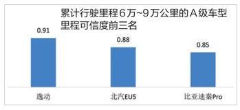 不過,當(dāng)累計行駛里程超過6萬公里時,A級車的平均里程可信度出現(xiàn)一定程度下降,降至0.86。里程可信度排名前三的車型為逸動、北汽EU5和比亞迪秦Pro,依次為0.91、0.88和0.85。