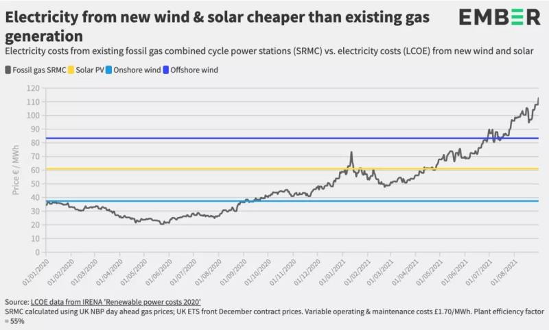 避免天然氣波動(dòng)的唯一辦法是加速向清潔電力的過渡,因?yàn)轱L(fēng)能和太陽(yáng)能不會(huì)受到燃料成本市場(chǎng)波動(dòng)的影響。根據(jù)國(guó)際可再生能源署最新發(fā)布的數(shù)據(jù),英國(guó)現(xiàn)有天然氣發(fā)電廠的發(fā)電成本是新建陸上風(fēng)電發(fā)電成本的三倍,幾乎是新建太陽(yáng)能發(fā)電成本的兩倍。即使是新建海上風(fēng)電的平準(zhǔn)成本(LCOE)目前也比天然氣氣發(fā)電便宜。即便不考慮碳價(jià),天然氣發(fā)電成本仍然比風(fēng)能和太陽(yáng)能更昂貴。