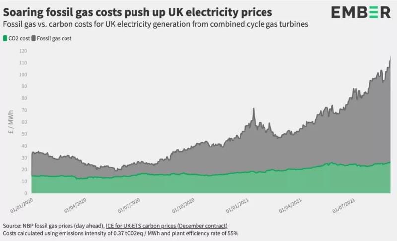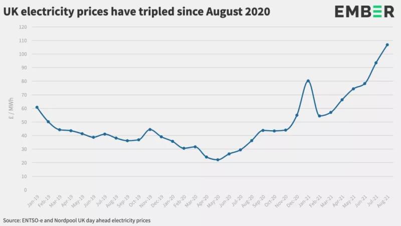 咨詢機(jī)構(gòu)Ember的最新分析顯示,英國(guó)的電價(jià)在過去一年上漲了兩倍。電價(jià)飛漲是多種因素共同作用的結(jié)果:北半球寒冷的冬季耗盡了天然氣儲(chǔ)存;亞洲需求和價(jià)格的增加導(dǎo)致液化天然氣運(yùn)往亞洲而不是歐洲;隨著新冠病毒限制的解除,全球經(jīng)濟(jì)反彈市場(chǎng)天然氣需求增加;從俄羅斯經(jīng)由烏克蘭進(jìn)口的天然氣尚未啟動(dòng),不能滿足歐洲需求的增長(zhǎng)。